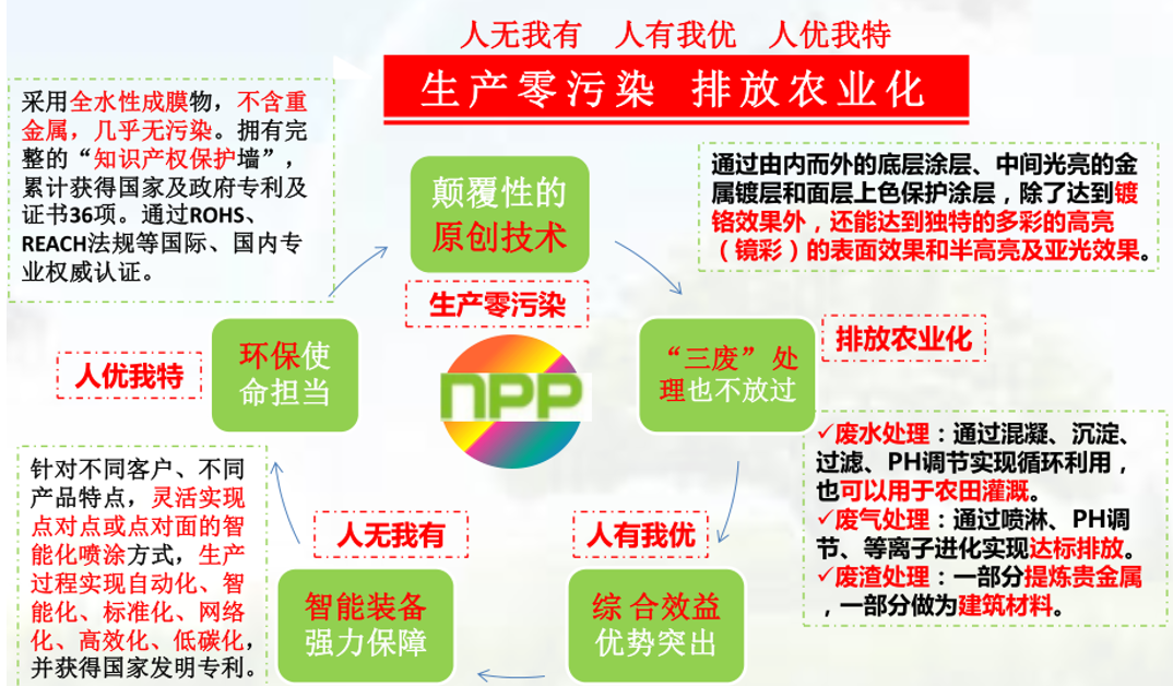 表面处理加工业是制造业乃至高新技术产业的基础工业,在全球表面处理业演变为"环境产业"、"绿色产业"的进程中,NPP人怀揣着改善第四大污染的强大使命,经过十多年的研发出零污染的NPP技术。